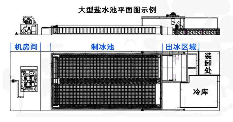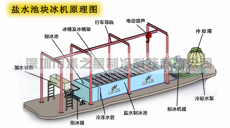 鹽水池塊冰機(jī)設(shè)備主要包括制冰機(jī)組、制冰鹽水池、冰桶及冰桶架、融冰池、倒冰架、加水器、吊冰車組成。